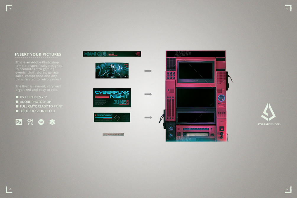 This cyberpunk flyer template is layered, very well organized and easy to edit. You can quickly switch from the clean version to the old worn vintage version. Also you can insert your own pictures and texts inside the four screens and the VHS tape label.
