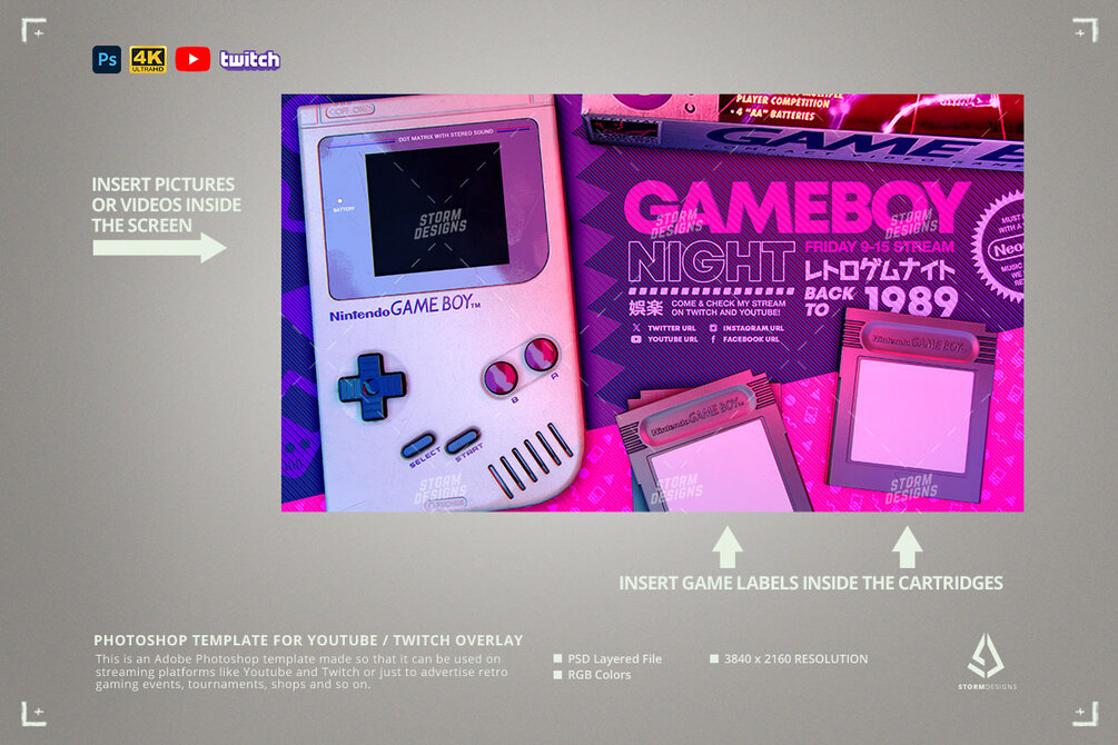This is an retro gaming stream overlay for OBS, Streamlabs, Twitch, Youtube, Kick or any other streaming platform, inspired by 1989 Nintendo Game Boy DMG. You can insert pictures inside the monitor and the two cartridge labels. Inside the file you will find a README file with the instructions on how to turn this .PSD template into a .PNG with transparency so that once you've done all the editings that you need you can just put a video gameplay of the Game Boy behind the screen. You can also use this template to promote retro gaming stores, tournaments, events and anything related to retrogaming.