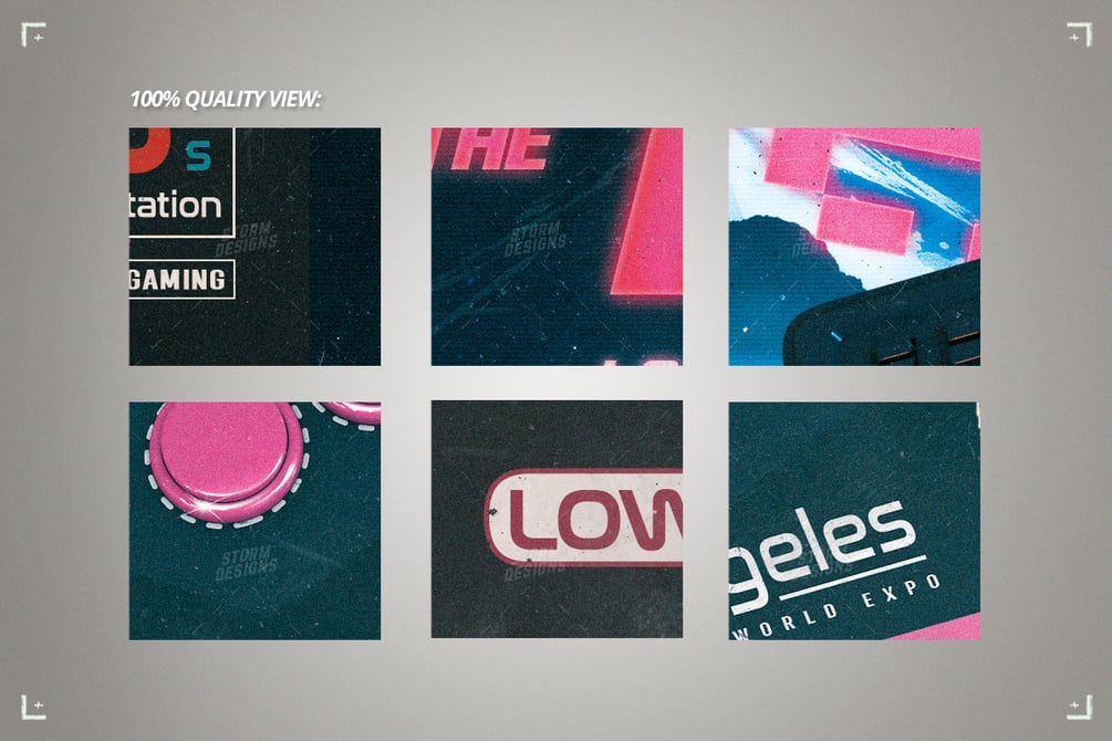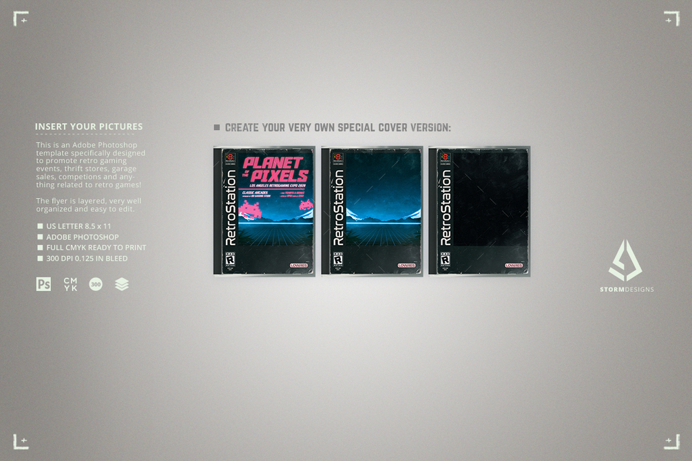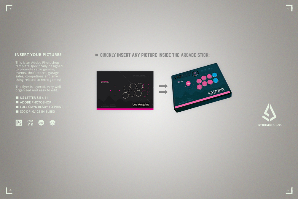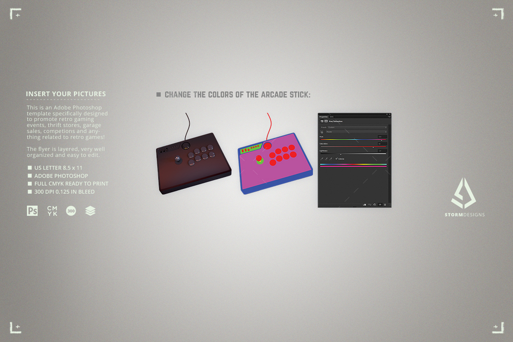 This classic 80s synthwave classic gaming flyer layout is very well organized and easy to edit. You can insert your own graphic inside the arcade stick and change the color of many elements of the fight stick via Hue/Saturation Adjustment Layers. Inside the downloaded file you'll find an Instructions text with the detailed informations on how to customize this arcade stick flyer design. Two quick-selections layers with the various elements of this retro gaming long box cover template will help you to quickly customize this flyer even further if you want to.