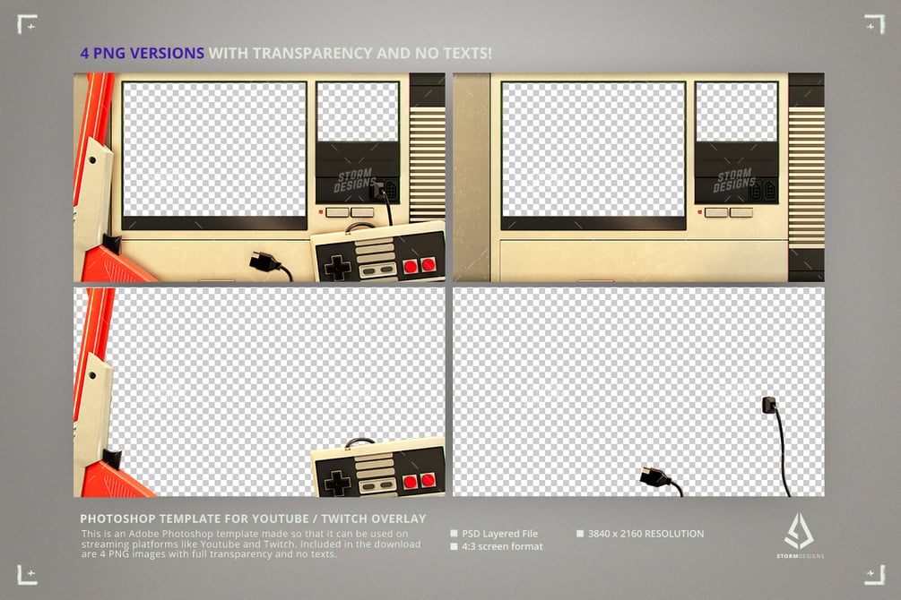 This is an Adobe Photoshop template created for streamers of retro gaming gameplays on Youtube, Twitch, Kick or any other streaming platform. This overlay template have been inspired by the classic NES (Nintendo Entertainment System), so it would probably be best for streaming or displaying your gameplay or speedruns of NES games. You can check the overlays of other consoles on my portfolio (Genesis, Famicom, Atari...).