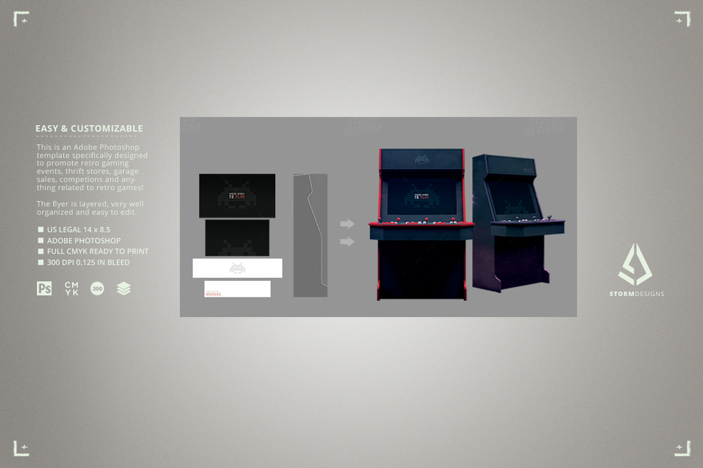 This arcade cabinet classic gaming flyer layout is very well organized and easy to edit. You can insert your own graphic and text inside the screen, side and top marquee of the cabinets. Inside the downloaded file you'll find an Instructions text with the detailed informations on how to change this arcade cabinet mock up flyer design. Two quick-selections layers with the various elements of the arcade cabinets separated by colors will help you to quickly customize this flyer even further if you want to.