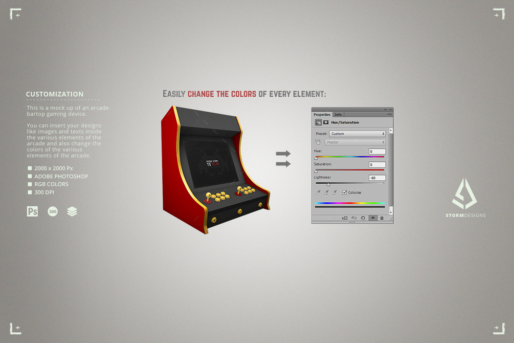 This retro gaming bartop arcade cabinet mockup template is very well organized and easy to edit. You can insert your own graphic and text inside the screen, screen frame, side panel, top marquee, control panel and bottom panel of the bartop arcade cabinet. You can also easily and quickly change the color of the various elements of this bartop arcade cabinet machine, like the buttons, the top marquee, the screen frame, the side panels, the rubber stripes on the panels, the control panel, the bottom panel, the sticks, the sticks' base and the sticks' spheres.