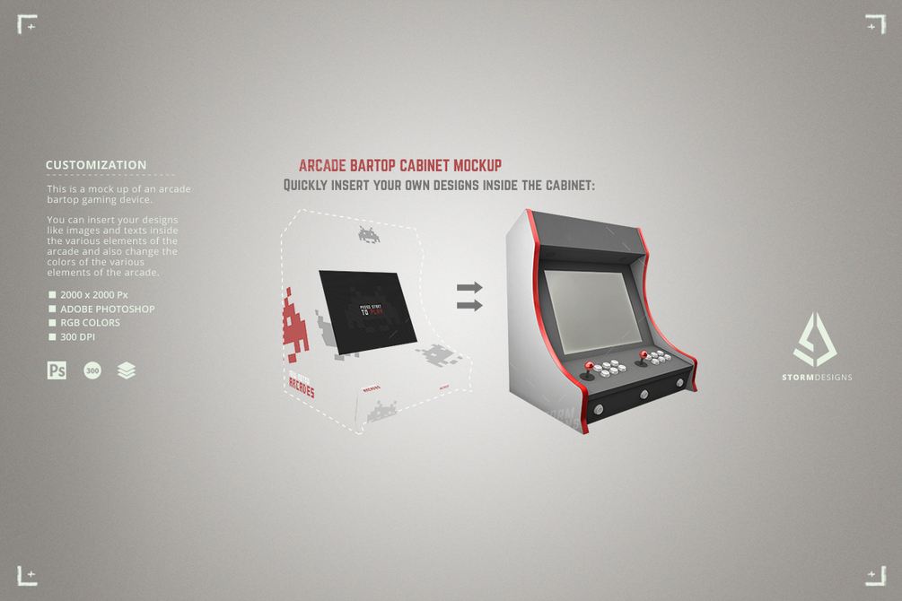 This is a retro gaming bartop arcade cabinet mockup Photoshop template designed to create quick and easy design of bartop arcade cabinet machines designed to promote retro gaming events, fighting games tournament, raspberry pi diy arcade machines build, retropie custom builds, arcade stick fighting tournaments, video games in general, classic gaming events and parties, coin op tournaments, gaming stores and shops, gaming fair, geek convenstions and any similar video gaming activity related to 1980s and 80s video games.