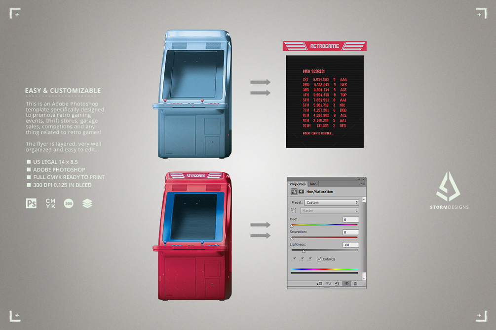 This arcade cabinet SHMUPS retro gaming flyer layout is very well organized and easy to edit. You can easily insert your own design and text inside the arcade cabinet screen and top panel marquee via Smart Objects, and you can quickly change the colors of the arcade cabinet, the stick spheres and the frame. Among the layers you'll find a selections layer that you can use to quickly select various elements of the arcade cabinet by using the Magic Wand Tool.