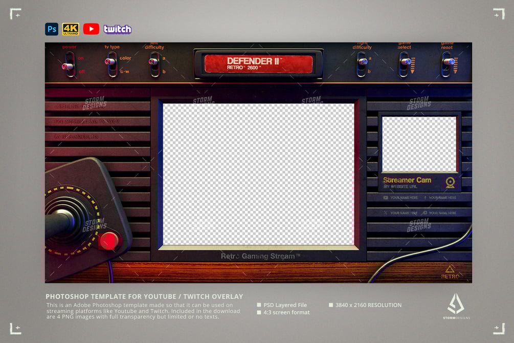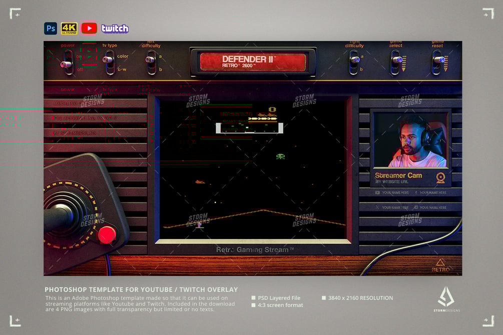 This is a retro gaming overlay template for Adobe Photoshop designed for streamers (Twitch, Youtube, Kick and so on) or youtubers who plays and stream old classic games. This stream pack overlay has been inspired by the classic console Atari 2600, with the famous wood grain and joystick. Along with the Adobe Photoshop .psd file, inside the download file you can find 4 .pngs with full transparency and various levels of details (check the previews), some of them has some texts, others don't.