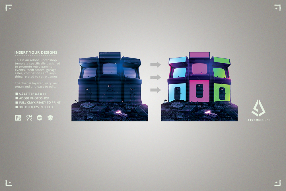 You can quickly edit the design of each individual screen of the arcade cabinets via Smart Object (check instructions inside), as well as edit the design of the top and bottom panel of each individual arcade cabinet (also done via Smart Objects). All that you see in the preview is included. The flyer has five different type of background that you can quickly choose from.