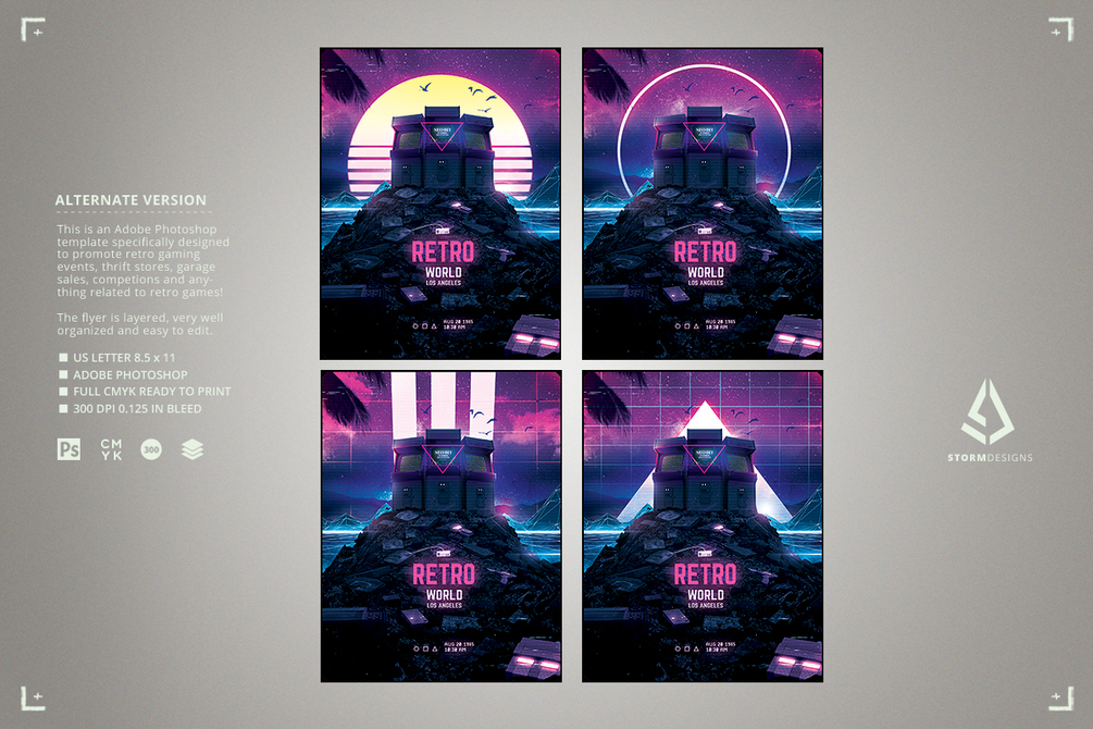 This is a retro gaming flyer Adobe Photoshop template specifically designed for retrogaming, video games, classic gaming events, video games documentaries, arcade cabinets tournaments, to promote retro gaming stores and shops and such similar activities involving old video games or you can use it to promote some synthwave, cyberpunk, retrowave or vaporwave neon music event.