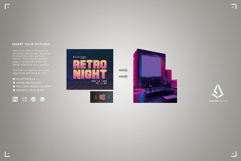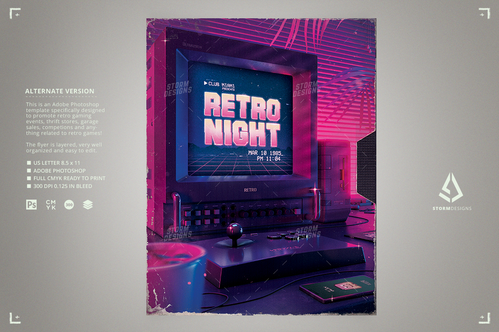 This classic 80s synthwave game night flyer layout is very well organized and easy to edit. You can insert your own graphic inside the monitor and smartphone screens (via Smart Objects) as you can see in the preview. Also with one simple click you can use the VHS tape cover effect.