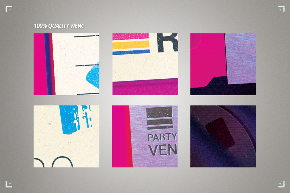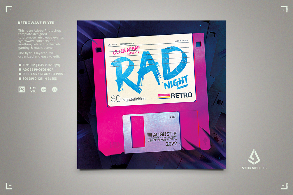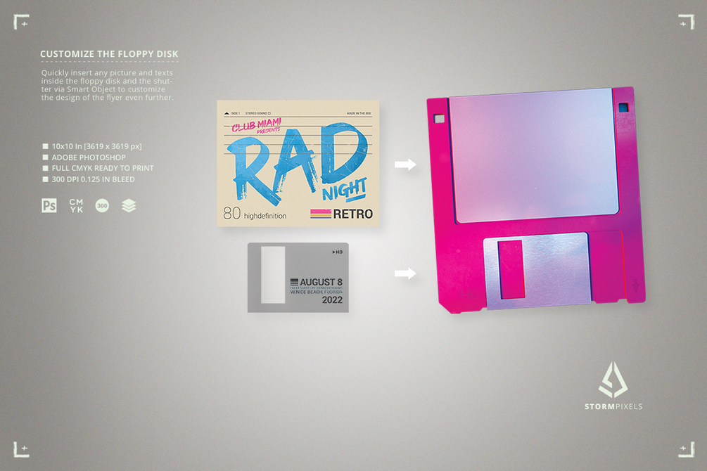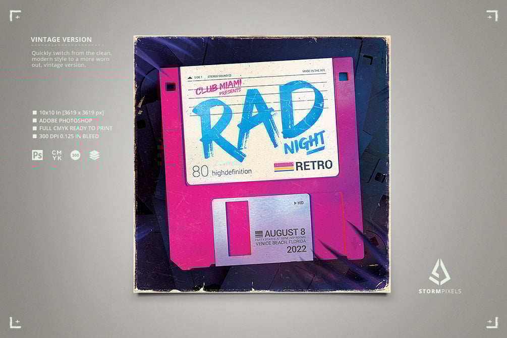 This retro sci-fi flyer template is very well organized and easy to edit. You can quickly switch from the clean version to the old vintage version. Also you can insert your own pictures and texts inside the floppy disk label and the shutter. The floppy disk is also on its own layers, so it can be removed (or animated).