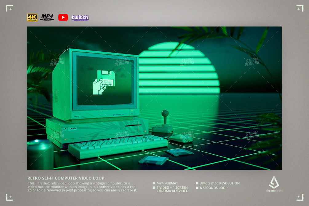 This is a loopable 8 seconds video of a vintage computer (Commodore Amiga A1000 with 1081 Monitor) in a retro sci fi synthwave universe. You can use this in your Youtube, Twitch, Kick or any other streaming platform channel. The download file includes the video in the preview, and another video with a red screen. This last video can be used if you want to customize the content of the screen in a video-editing software like Adobe Premiere or DaVinci Resolve, so you can quickly replace the red screen with your logo, animation or a playing video.