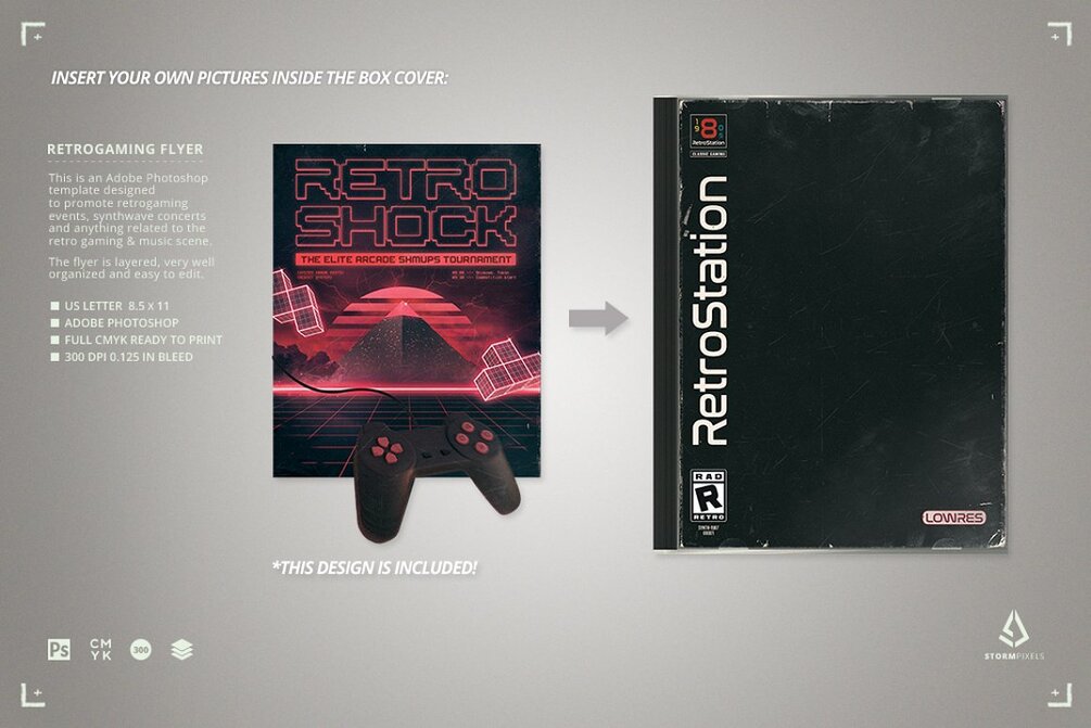 This is a retrowave flyer Adobe Photoshop template inspired by the classic Playstation PSX long box cover art, and specifically designed to promote retrogaming tournaments, gaming shops, retrowave concerts and or synthwave parties, video games events, vaporwave events, to promote music, videos, movies or documentaries related to the synthwave, futurewave, outrun, cyberpunk and generally retro vintage events that recreate the vibe of the 1980s.