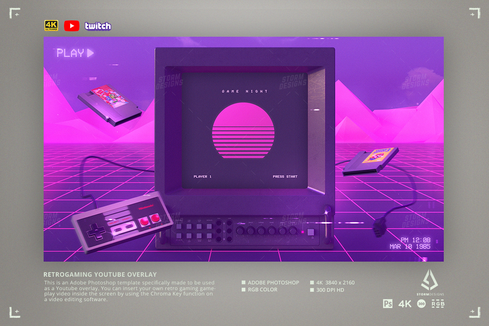 This is a retro gaming overlay template specifically made for Youtube, Twitch or any other streaming platform. This Adobe Photoshop vaporwave template has been specifically designed to promote retro gaming channels and content. The size is 4K (3840 pixels x 2160), 300 dpi, RGB colors.
