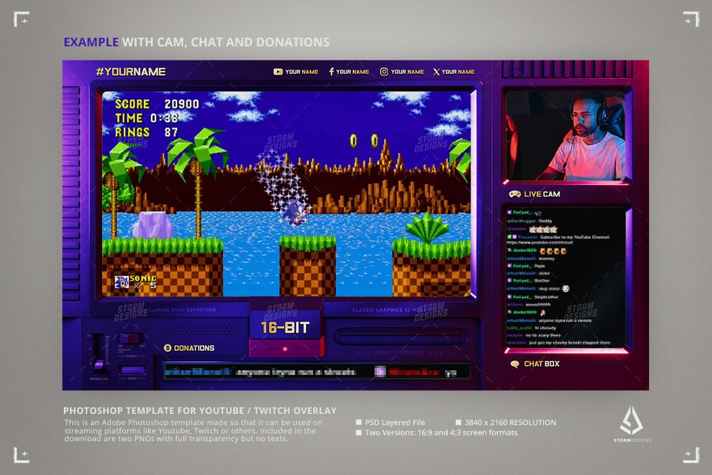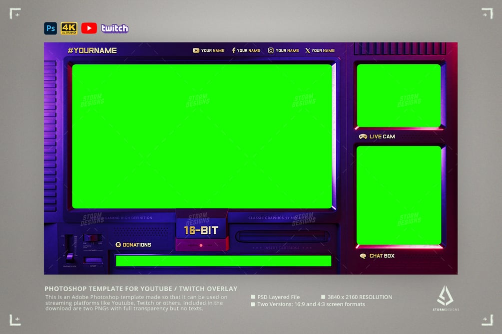 This is an Adobe Photoshop template to be used as an overlay to stream any type of gaming in any streaming platform (Youtube, Twitch, Kick, etc.). The overlay has been inspired by retro consoles like the SEGA Genesis / Mega Drive. You can use the main screen to stream your game, the right top screen for your camera, the bottom box for your chat, and the bottom strip for donations/shotouts (or you can use these extra boxes for anything else, like logos, high scores, brands and so on).