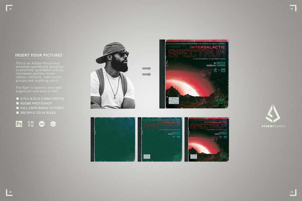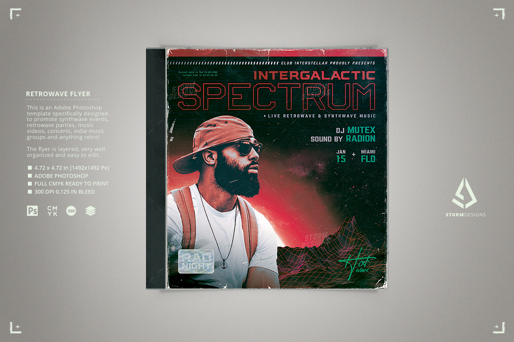 This classic 80s synthwave retro wave flyer CD cover mock up layout is very well organized, layered and easy to edit. As you can see from the preview, you can insert your own pictures quickly and easily into the flyer to promote your clubs or your retro music.