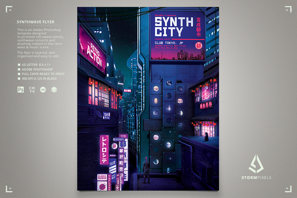 This is a classic 1980s synthwave flyer Photoshop template designed to advertise synthwave music parties, retrowave music videos, vaporwave and neon club, stores, shops and any type of musical event of new retro wave singers and anything related to the flashback, neon 80s music scene.