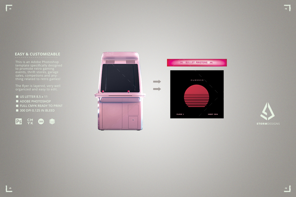 This SHMUPS video games flyer layout is very well organized and easy to edit. You can easily insert your own design and text inside the arcade cabinet screen and top panel marquee via Smart Objects, and you can quickly change the colors of the arcade cabinet and the stick spheres. Also you can turn on or off the light of the arcade stick spheres so that is seems like they're glowing.