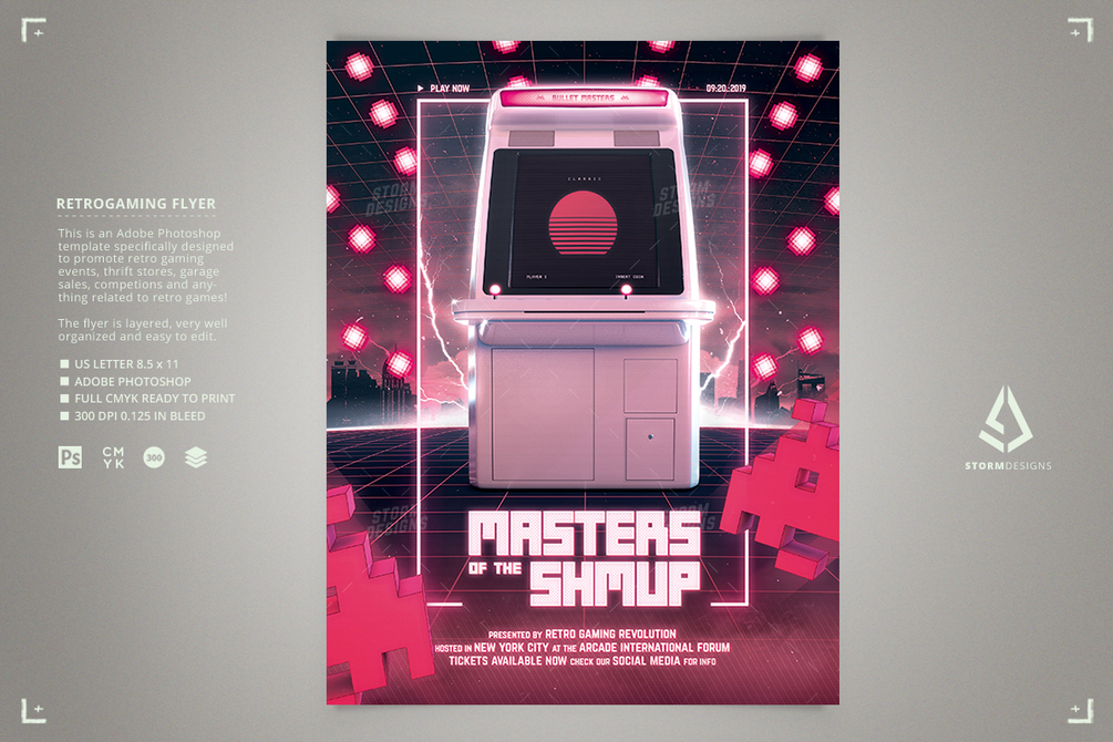 This is a retro gaming flyer Photoshop template specifically designed to promote SHMUP (shoot 'em up or STG) tournaments, contests, videos and so on. The flyer can also be used to promote anything about retro games, classic gaming documentaries about 8 bit or 16 bit gen arcade games, video games expos and fairs, shops, stores and thrift stores.