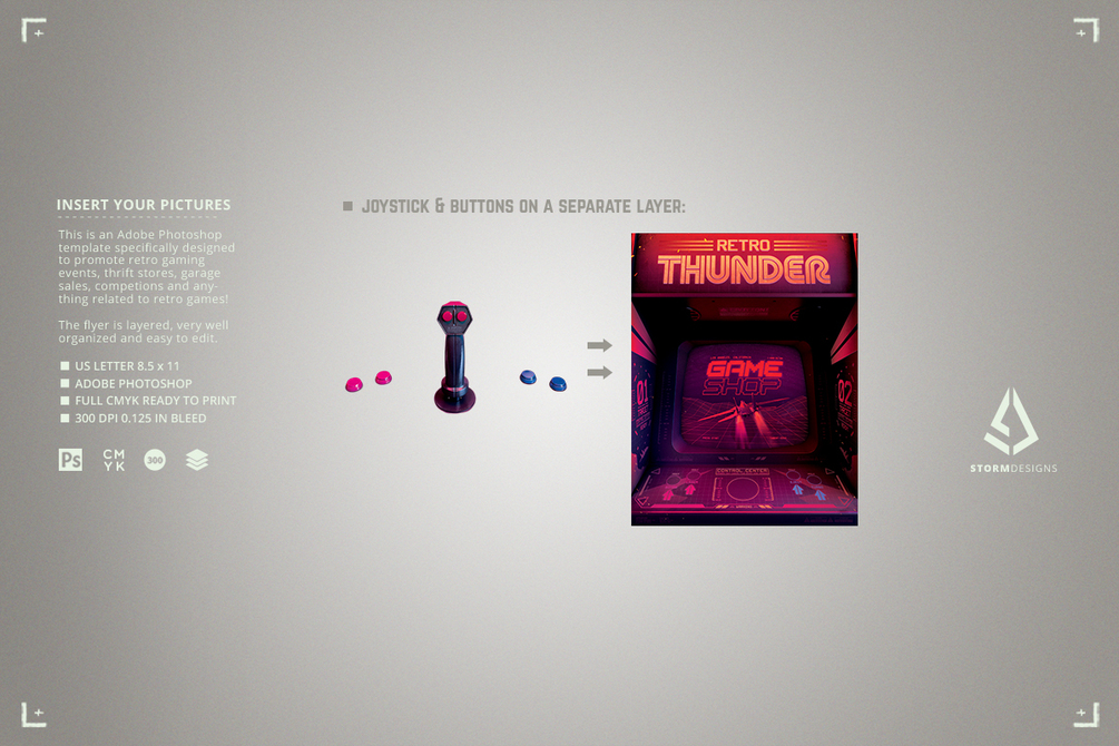 This classic 80s synthwave classic gaming flyer layout is very well organized and easy to edit. You can insert your own graphic inside the various parts of the cabinet (via Smart Objects) as you can see in the preview, or edit the existing ones.