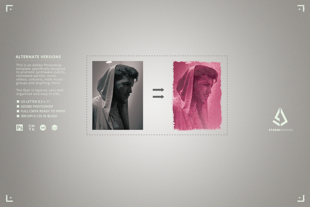 This retro 1980s synthwave flyer layout is very well organized and easy to edit. You can quickly insert your own picture via Smart Object as shown in the preview. Inside the downloaded file you'll find an Instructions text with the detailed informations on how to edit this retrowave flyer poster.