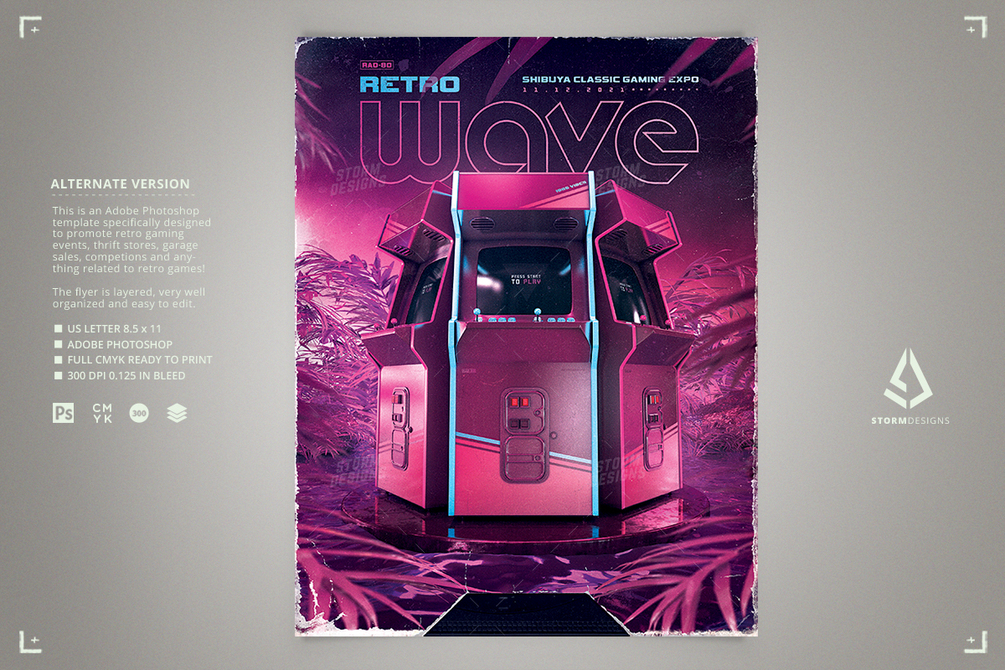 This classic 80s synthwave classic gaming flyer layout is very well organized and easy to edit. You can insert your own graphic inside the screens, top and bottom panels of each arcade cabinet via Smart Objects (check the Instructions file inside the download)