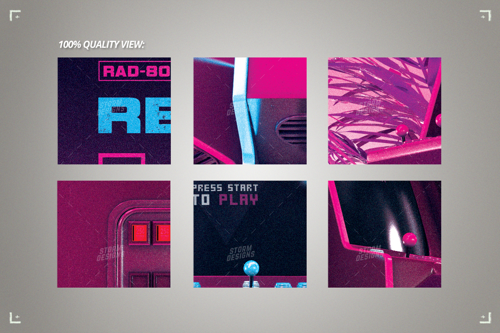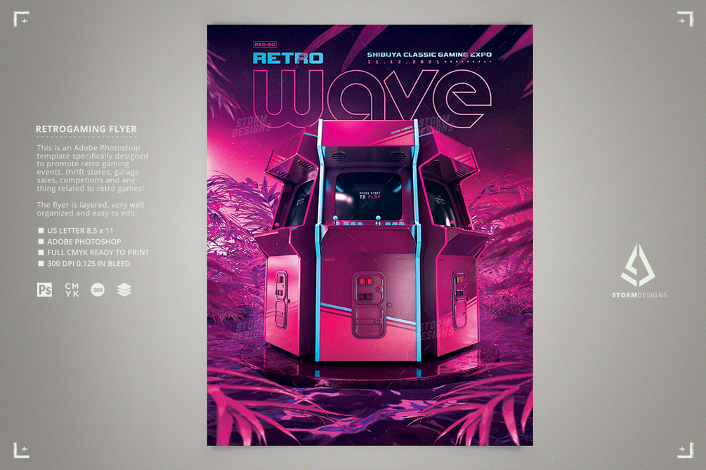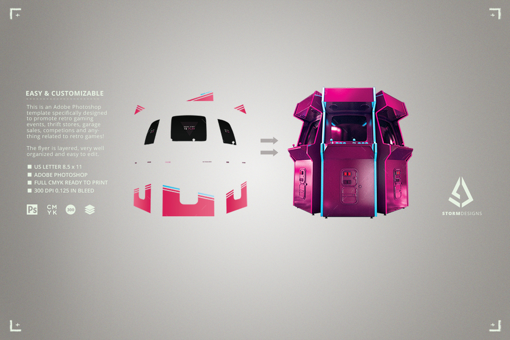 This classic 80s synthwave classic gaming flyer layout is very well organized and easy to edit. You can insert your own graphic inside the screens, top and bottom panels of each arcade cabinet via Smart Objects (check the Instructions file inside the download)